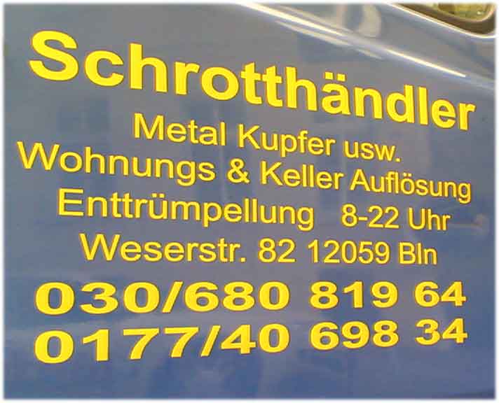 Anzeigen Anzeigen können per email an mich gesendet werden und erscheinen dann hier! Preisliste Der Käufer sollte bei Kaufinteresse zuerst den vereinbarten Betrag auf Ihr Konto überweisen. Dann senden Sie die Ware los. Junge Energie ist übrigens an den auf eine hier erschienene Anzeige hin stattfindenen Geschäften in keiner Weise (etwa als Vertragspartei) beteiligt und muss jede Form von Haftungsansprüchen im Vorhinein ablehnen. Nachtflohmarkt im SO 36, 17.11.2010 - EMPFEHLUNG ![]() ![]() Weserstraße 82 - 12059 Berlin Wohnungsauflösungen - Entrümpelungen - Kellerreinigung Alles zum günstigen Preis - Abholung von Schrott kostenlos 24 Std zu erreichen, auch per SMS Telefon: 030 / 680 819 64 Mobil: 0177 / 40698 34 Suche Akustikbass mit Tonabnehmer. turmfalk@web.de "Führer durch die königliche Gemäldegalerie zu Dresden" von 1910!!! 100 Abb., 3 Grundrisse, Hrsg: Carl Roscher €20,- + Versand 2,50 flohmarkt@junge-energie.de Kamera KIEV 60 TTL, Mittelformat, Normalobjektiv, Tasche. Preis VS. Email an lipostal@web.de Pentax auto 110, Mini-Spiegelreflex-Pocket-Kamera für Pocketfilme, verschiedene Objektive und Filter, Blitzlicht, Kameratasche. Preis VS. Email an lipostal@web.de Haftungshinweis: Mit Urteil vom 12. Mai 1998 hat das Landgericht Hamburg entschieden, dass man durch die Aufnahme eines Links die Inhalte der gelinkten Seite(n) gegebenfalls mit zu verantworten hat. Dies ist nicht der Fall, wenn man sich ausdrücklich von den Inhalten der gelinkten Seite(n) distanziert. Da auf dieser Seite und den zugehörigen Seiten einige Links zu anderen Websites ohne Distanzierung und ohne Kommentierung angeboten werden, wird hiermit Folgendes erklärt: Jede auf meiner/meinen Seite(n) gelinkten Website (umgangssprachlich oft als "Homepage" bezeichnet) wurde besucht und geprüft. Da aber Internet-Seiten einem ständigen Wandel unterliegen, lehne ich jede Verantwortung für den Inhalt der gelinkten Websites (Homepages) ab. Dies gilt insbesondere für Werbeeinblendungen (Banner), und zwar auch dann, wenn der Autor der Website (Homepage) selbst keine Verantwortung für die Art und den Inhalt dieser Einblendungen trägt. Sollte ich davon Kenntnis erhalten, dass Inhalte der gelinkten Website (Homepage) gegen geltendes Recht verstoßen oder verstoßen könnten, werden die betreffenden Links sofort entfernt. Falls Euch (Ihnen) ein derartiger Link auffällt, schreibt (schreiben Sie) mir bitte eine email, damit ich diesen Link sofort entfernen kann. Danke! Telefon: 0173 615 0 555 ![]()